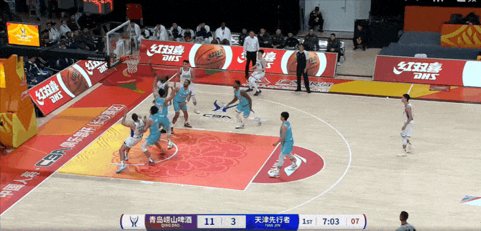 第一節(jié)比賽中,破強(qiáng)克萊伯恩突破強(qiáng)起上籃打進(jìn),起上天津隊目前5-11暫時落后青島。進(jìn)天津隊