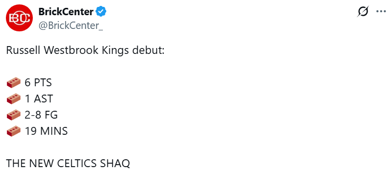 賽后,調(diào)侃大鯊美媒BrickCenter更推,威少曬出了拉塞爾-威斯布魯克本場(chǎng)比賽的國王表現(xiàn):