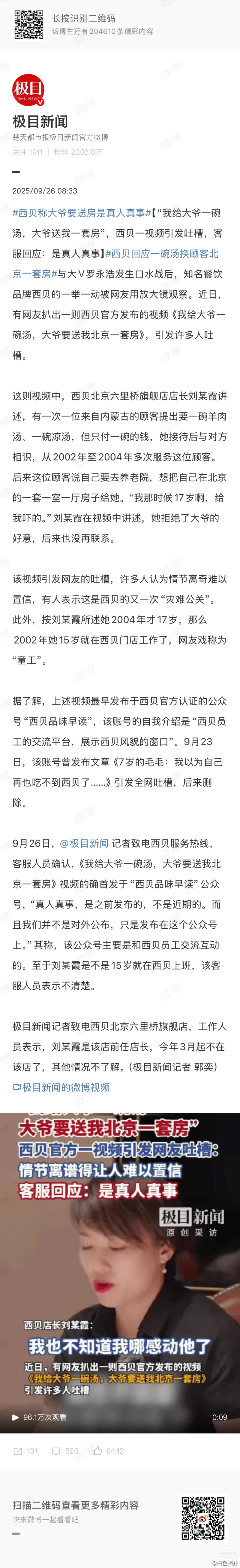 我給大爺一碗湯,大爺送我一套房”,西貝一視頻引發(fā)吐槽,客服回應:是真人真事