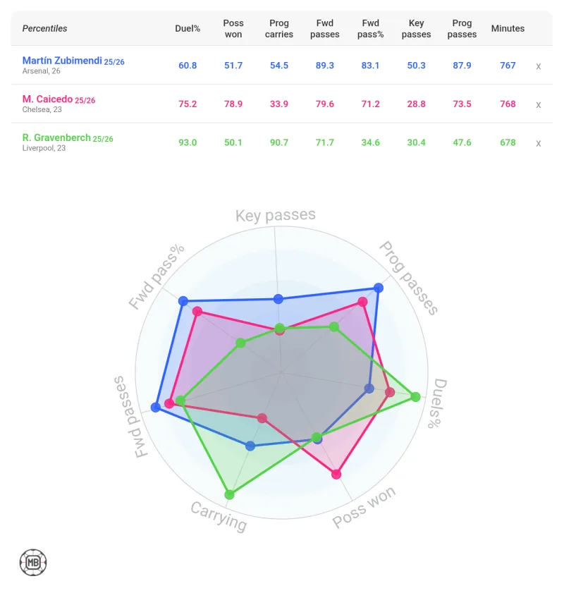 這里嘗試用一些我認(rèn)為更合理的高階技術(shù)指標(biāo)對(duì)比一下蘇維門(mén)迪,凱塞多和格拉芬貝赫三位優(yōu)秀后腰,不知道和大家的觀察一不一樣。