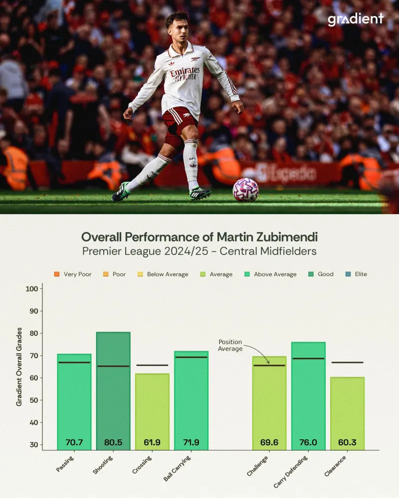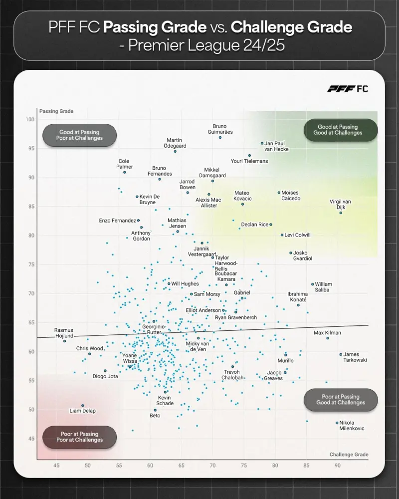 對(duì)抗水平:采用Gradient的對(duì)抗(Challenge)評(píng)分,綜合了高空球,二分之一球和搶斷時(shí)的表現(xiàn)。