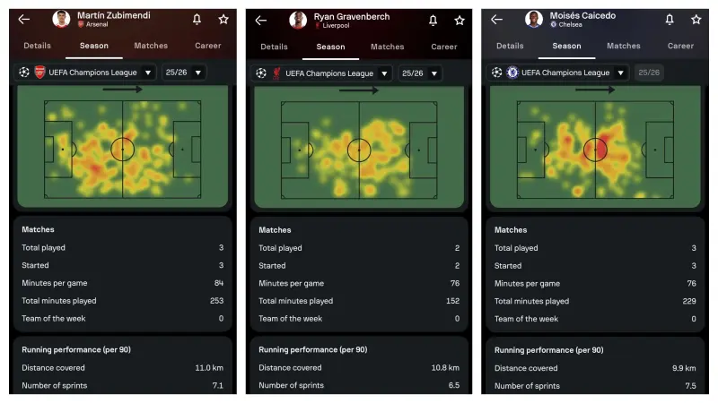 跑動(dòng)距離:無(wú)球跑動(dòng)和防守覆蓋的重要指標(biāo)。由于聯(lián)賽數(shù)據(jù)不公開(kāi),采用Sofascore的本賽季歐冠的90分鐘平均距離,單位公里。