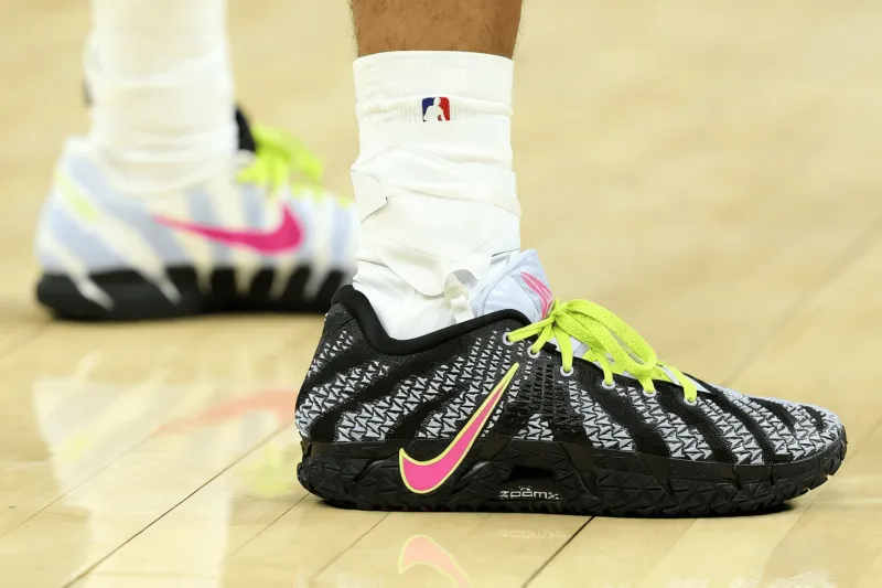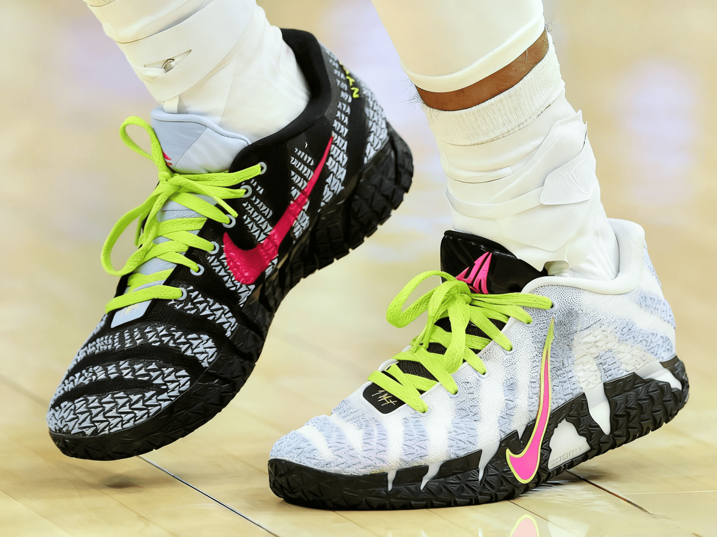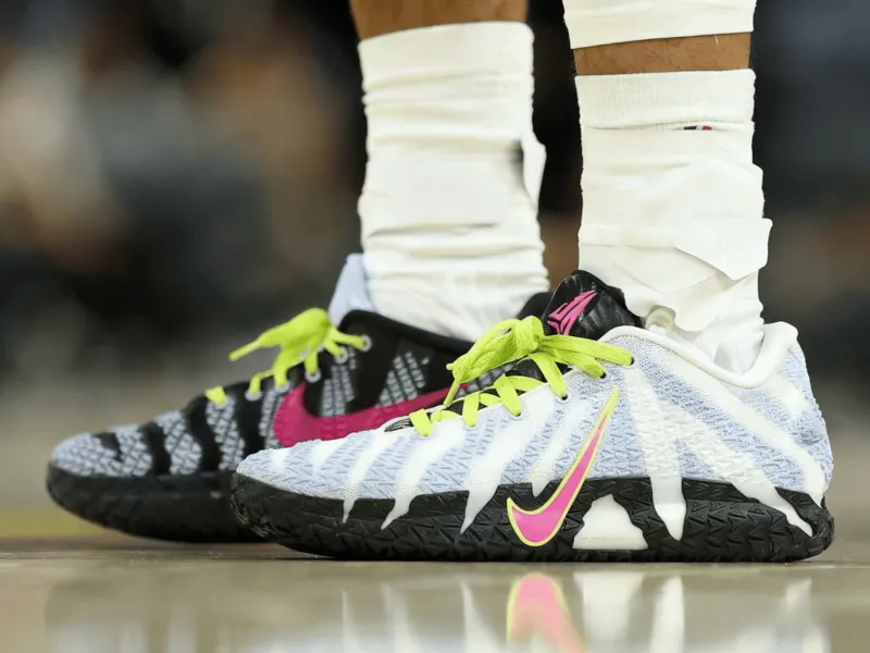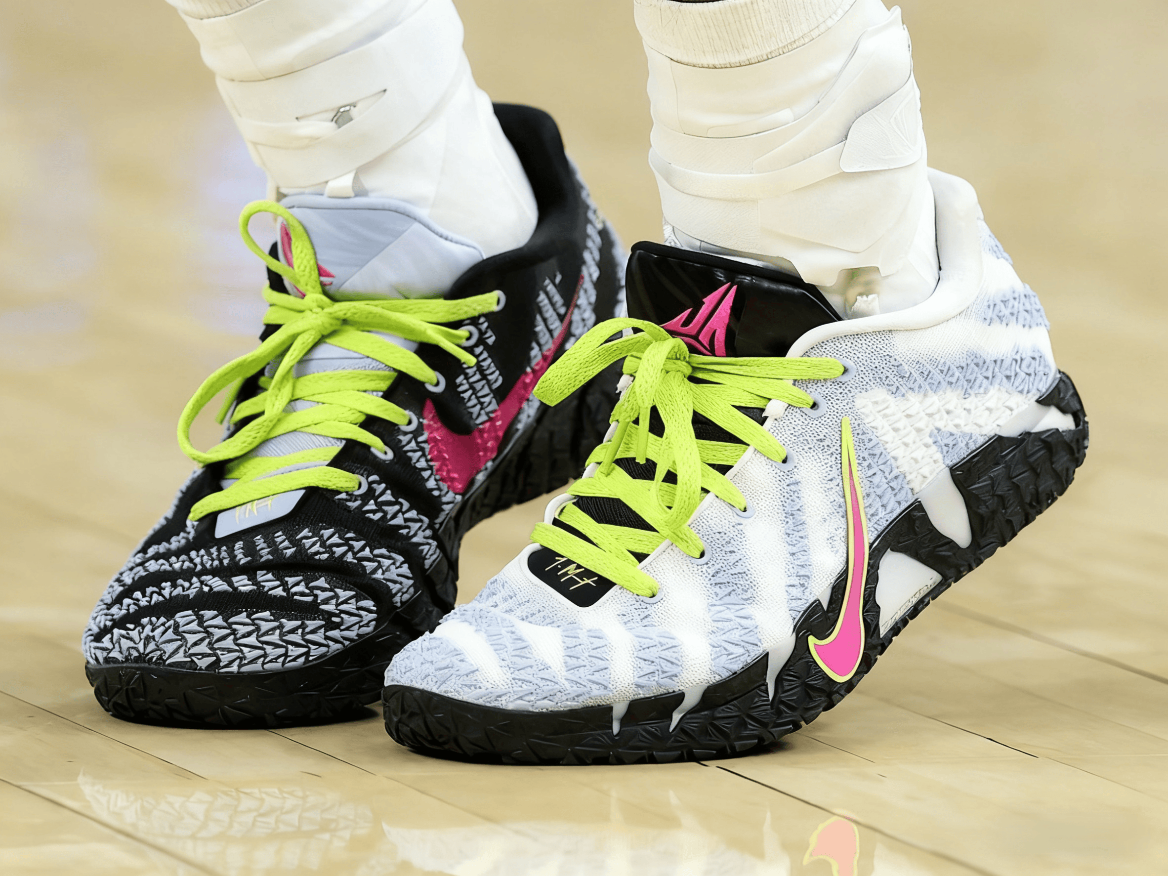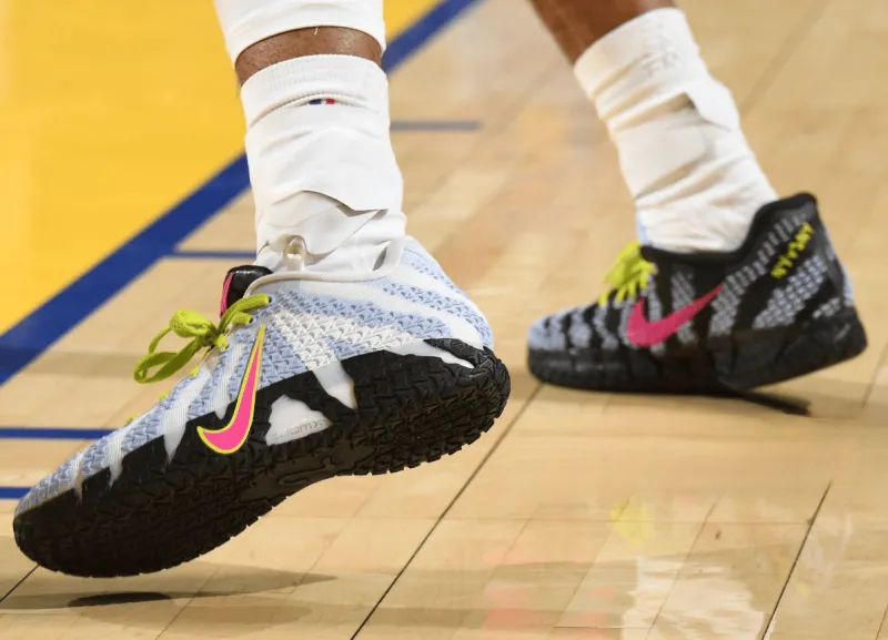 比賽中,板莫莫蘭特上腳鴛鴦配色Nike JA3。鴛鴦
