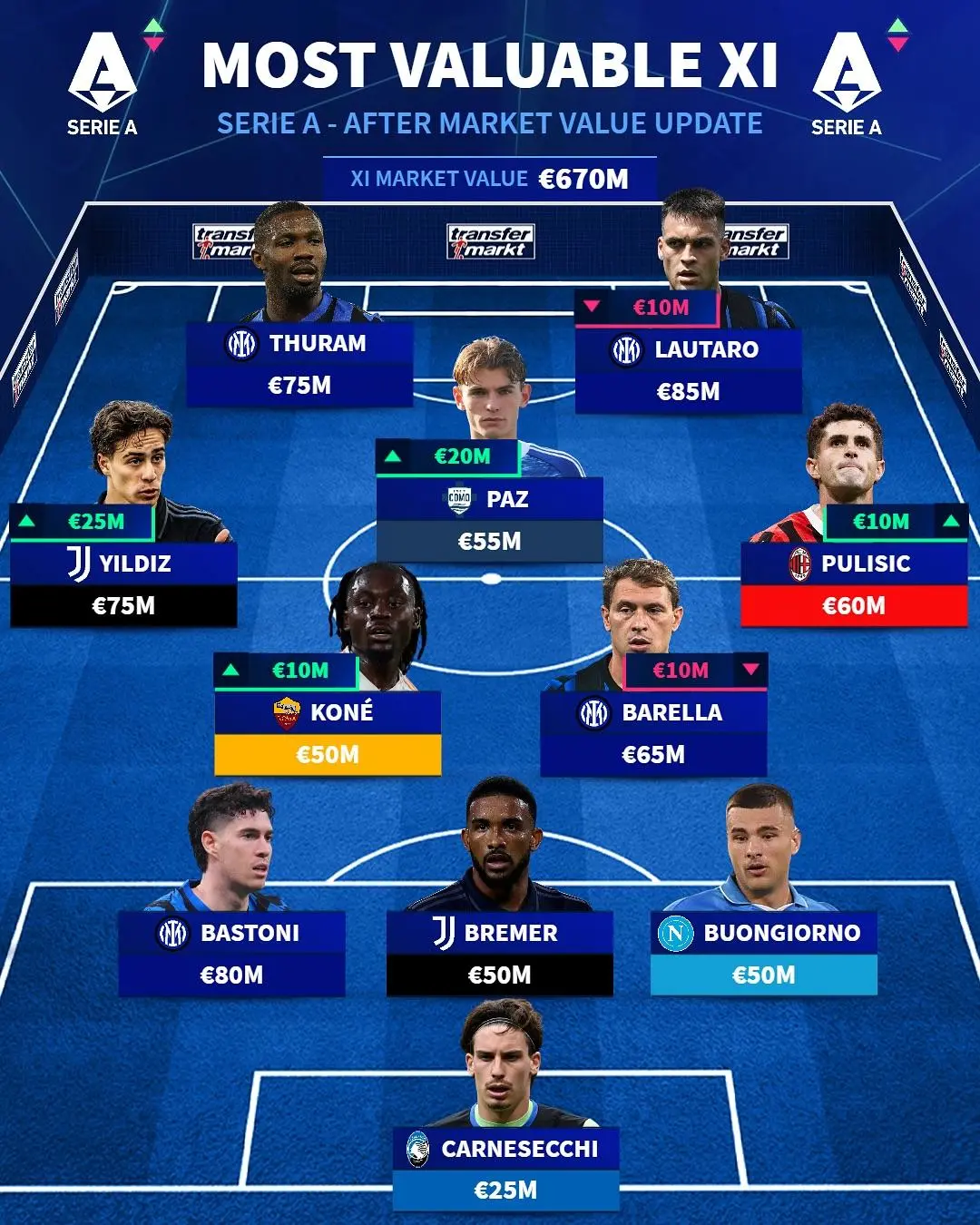 虎撲10月08日訊 德國轉(zhuǎn)會市場近期更新了意甲球員的身價,并按照身價排列出了一套最貴陣容。