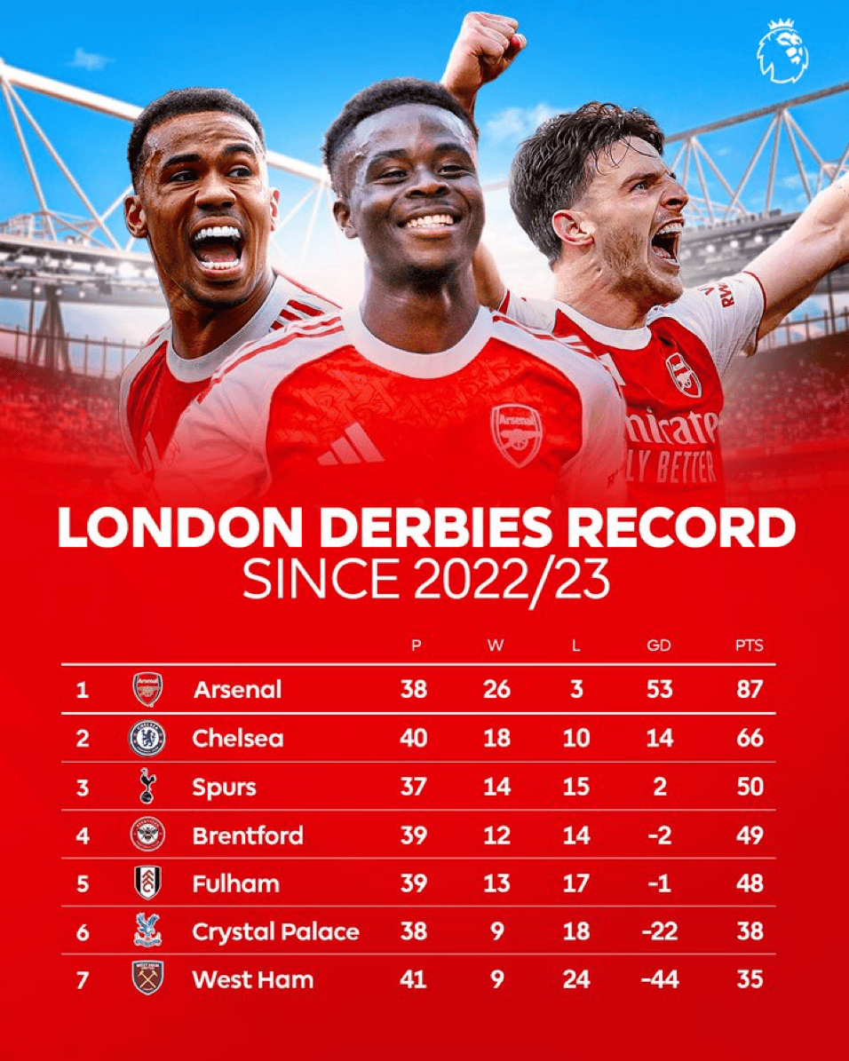 虎撲10月24日訊 英超聯(lián)賽官方統(tǒng)計了自22/23賽季以來,倫敦球隊內(nèi)戰(zhàn)的積分榜,詳情如下: