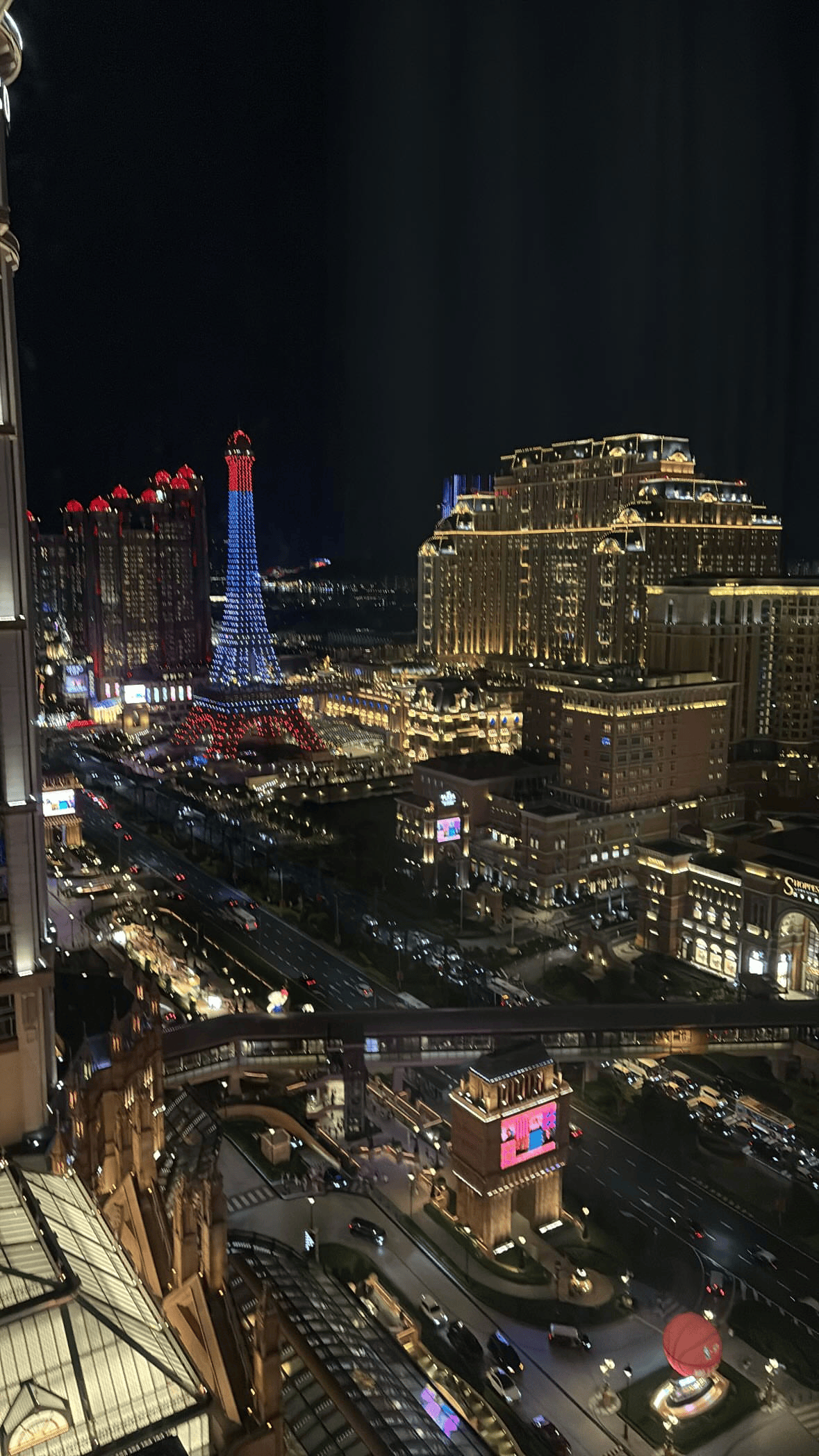 圖中為狄龍從酒店窗外拍攝的板金碧輝澳門路氹金光大道區(qū)域的夜景,包含威尼斯人、煌狄巴黎人等標(biāo)志性度假酒店建筑。出澳