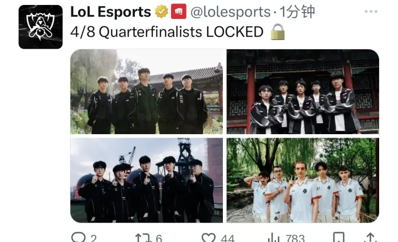 虎撲10月22日訊 LOL賽事官推曬照:已經(jīng)有四支隊(duì)伍拿到了八強(qiáng)的門票