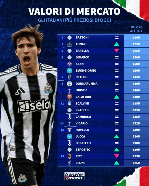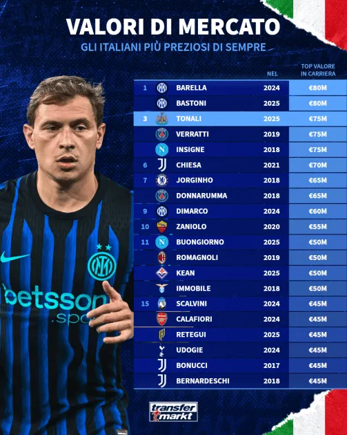 托納利這一身價(jià)的提升,是他在2025/26賽季初段穩(wěn)定表現(xiàn)的直接反映。他在競爭激烈的英超聯(lián)賽中繼續(xù)閃耀,也受益于巴雷拉估值下調(diào)這一背景。不過這并不削弱他本人的價(jià)值。7500萬歐元的身價(jià)讓他距離意大利球員歷史紀(jì)錄只差一步——那正是巴雷拉在2024年創(chuàng)造的最高值,目前則由巴斯托尼持有。