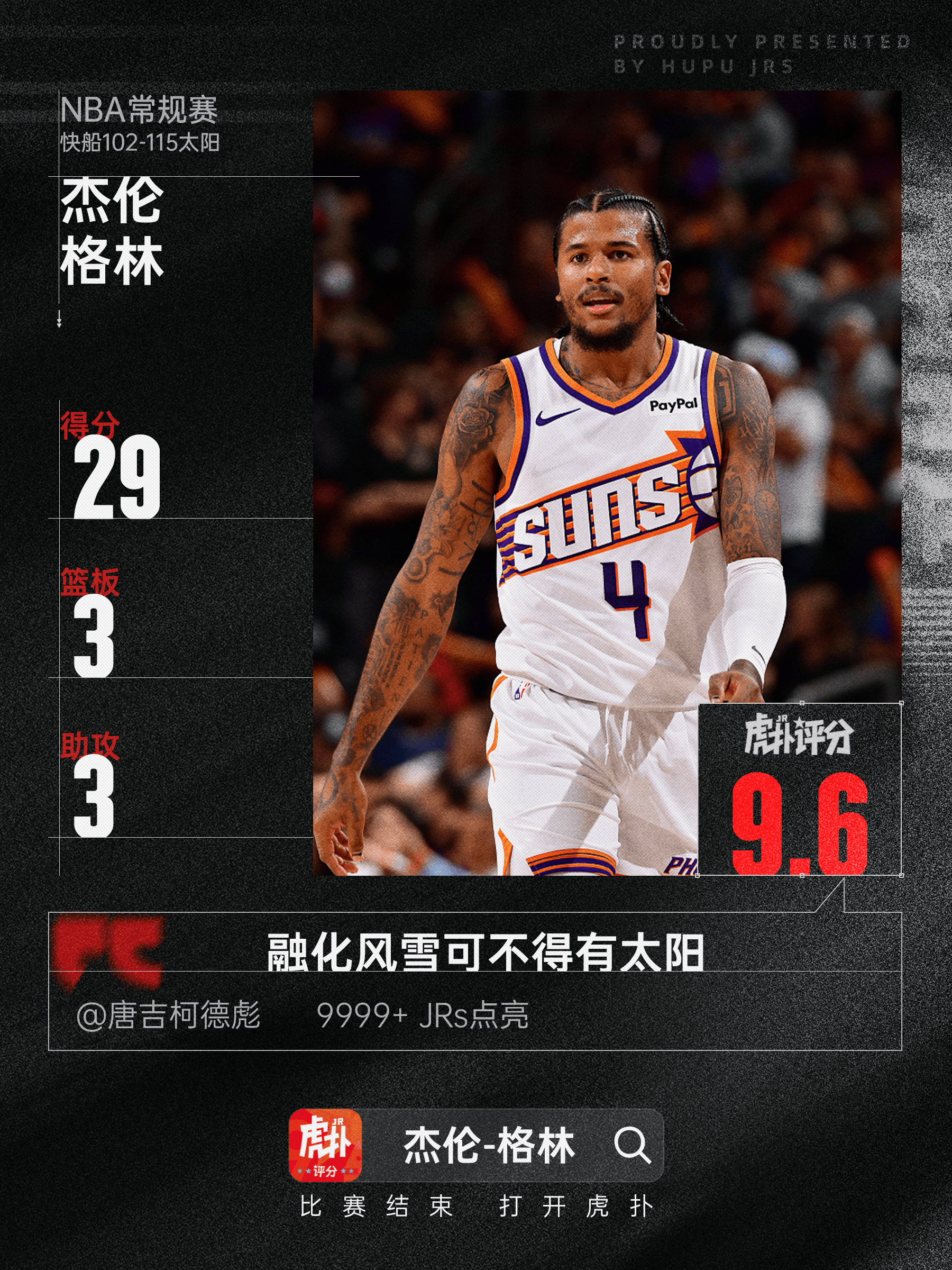 值得一提的中砍助攻是,本場(chǎng)比賽是下分格林代表太陽(yáng)出戰(zhàn)的第一場(chǎng)比賽。