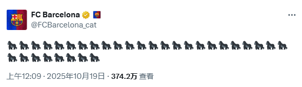 虎撲10月21日訊 西甲第9輪巴薩2-1吉羅納,阿勞霍補時絕殺比賽,絕殺吉羅巴薩官方賬號當即連發(fā)32個??emoji。納巴