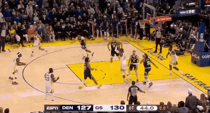 NBA常規(guī)賽,勇士對(duì)陣掘金的壓哨勇士比賽正在進(jìn)行中。
