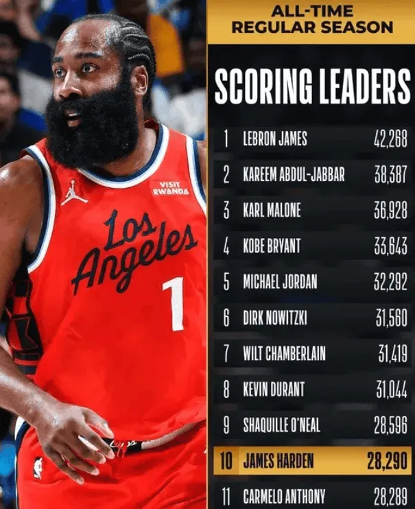 哈登表示當他看到排在自己前面進入歷史得分榜前十的那些球員——勒布朗-詹姆斯、卡里姆-阿卜杜爾-賈巴爾、卡爾-馬龍、科比-布萊恩特、邁克爾-喬丹、德克-諾維茨基、威爾特-張伯倫、凱文-杜蘭特和沙奎爾-奧尼爾這樣的巨星時,他對自己能走到這一步感到驚訝。