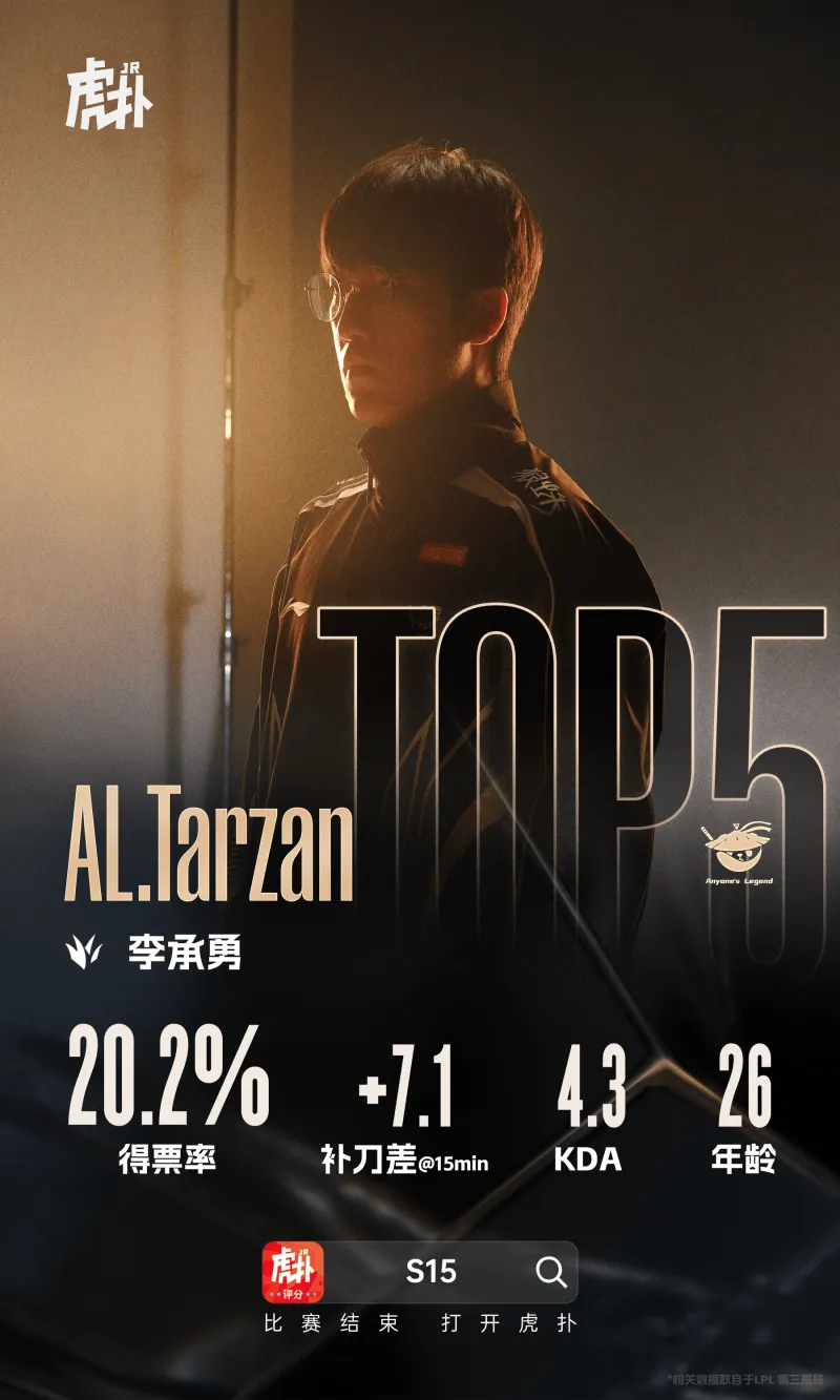 AL.Tarzan以20.2%的得票率當(dāng)選S15全球總決賽No.5選手。