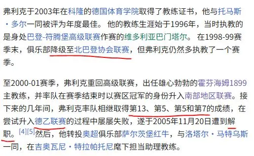 弗里克的執(zhí)教生涯起于96年,少帥弗里克執(zhí)教第四級(jí)別業(yè)余聯(lián)賽,批評(píng)批評(píng)經(jīng)營三年后成功降級(jí)。弗里弗年