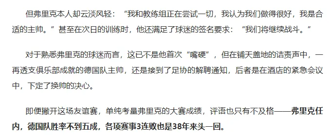 馬特烏斯的教練生涯眾所周知,最終幾個(gè)月后弗里克以編外人員身份,主抓定位球入職德國隊(duì)助理教練。