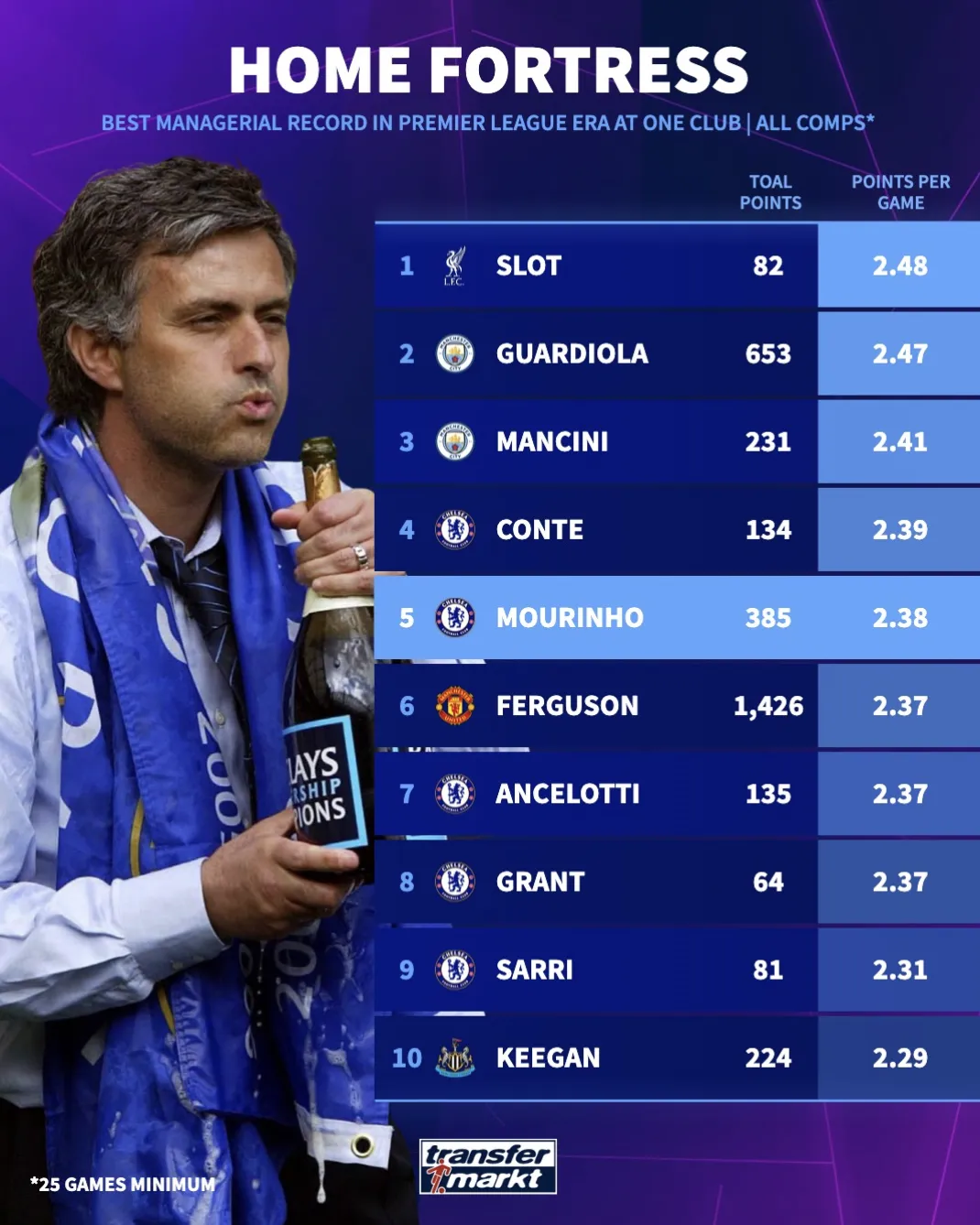 目前利物浦主帥斯洛特和曼城主帥瓜迪奧拉場均分別得2.48分和2.47分,排名前二。本周早些時(shí)候重返切爾西主場斯坦福橋的穆里尼奧在切爾西的主場執(zhí)教成績位列英超時(shí)代所有教練的第五位。