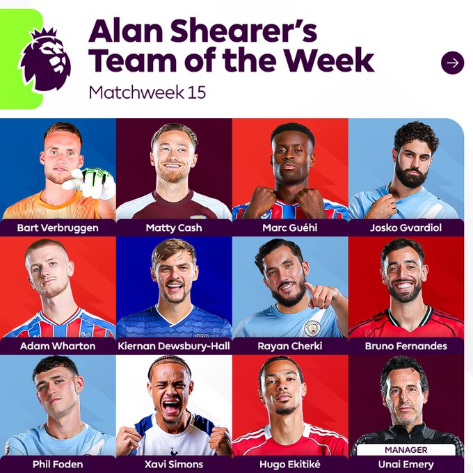 虎撲12月09日訊 英超官方公布阿蘭-希勒評(píng)選的聯(lián)賽第15輪最佳陣容,具體如下: