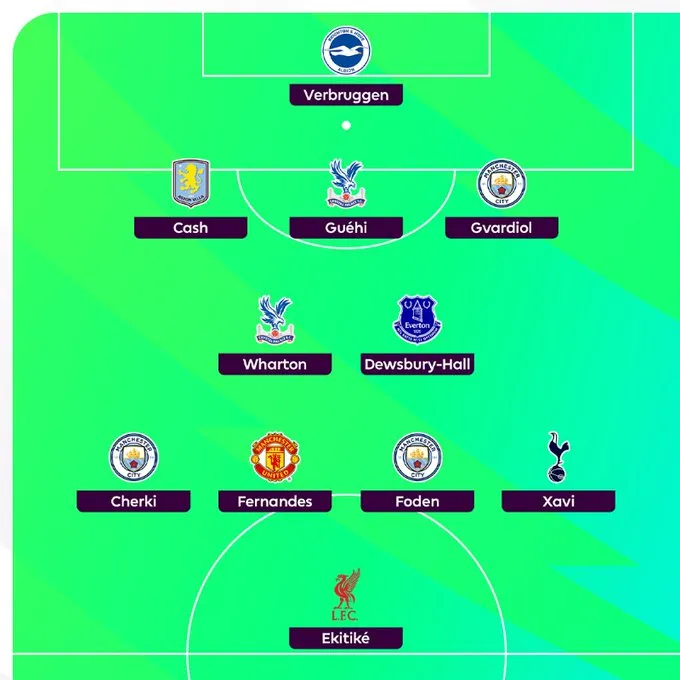 中場(chǎng):沃頓(水晶宮)、費(fèi)謝霍爾(埃弗頓)、爾基謝爾基(曼城)、B費(fèi)(曼聯(lián))、福登(曼城)、西蒙斯(熱刺)