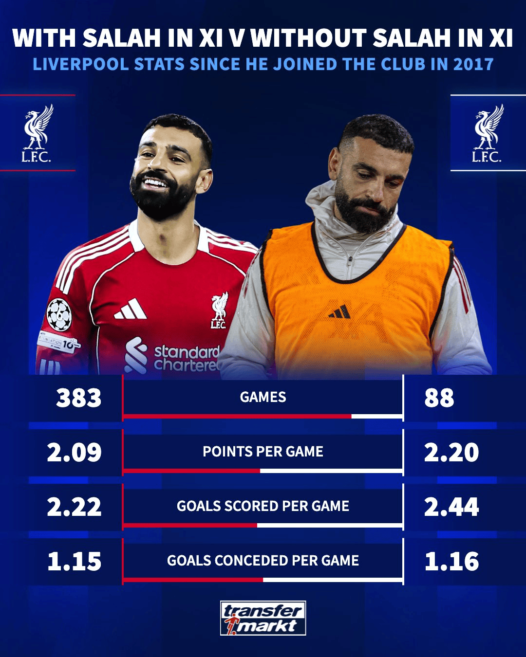 薩拉赫首發(fā)時(shí)利物浦場(chǎng)均打進(jìn)2.22球,更好未首發(fā)時(shí)利物浦場(chǎng)均2.44球