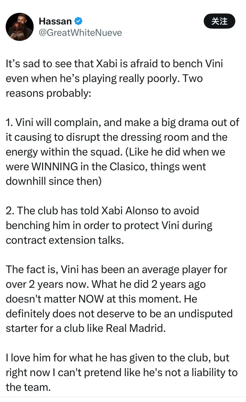 轉(zhuǎn):令人遺憾的是,即使維尼修斯表現(xiàn)糟糕,哈維也不敢把他放在替補(bǔ)席上。原因可能有兩點(diǎn):