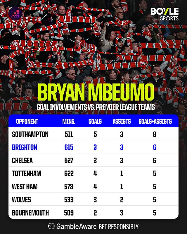 其中姆伯莫在對陣布萊頓時直接參與了6粒進(jìn)球(3球3助),陣英為其對陣英超單一球隊并列第二多。超單
