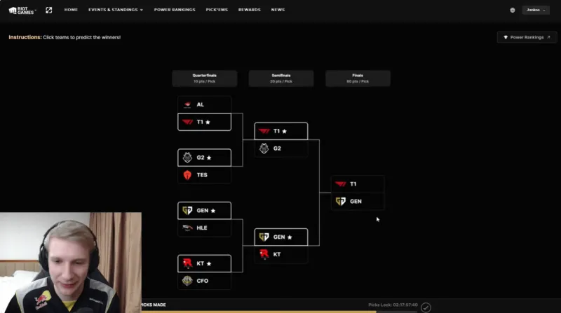 虎撲10月26日訊 Jankos今日在直播中預(yù)測淘汰賽,具體如下: