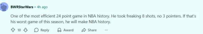 -(10贊)NBA史上最高效的24分比賽之一。他一共出手8次,沒有三分球。如果這是他本賽季最差的一場比賽,他將創(chuàng)造NBA的歷史。