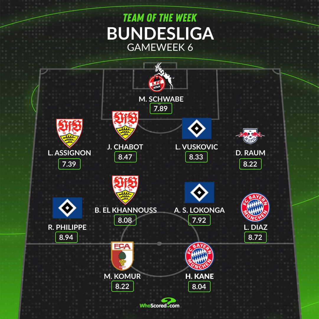 虎撲10月06日訊 路易斯-迪亞斯和哈里-凱恩入選WhoScored評(píng)出的德甲本輪最佳陣容。