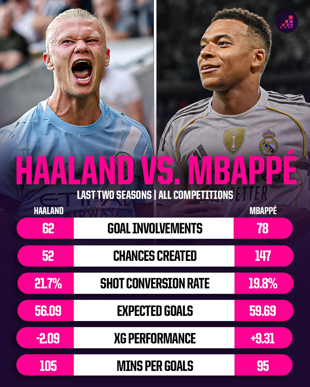 虎撲12月10日訊 本輪歐冠,曼城將在客場對陣皇馬。姆巴賽前Opta數(shù)據(jù)統(tǒng)計(jì)盤點(diǎn)哈蘭德與姆巴佩近2個(gè)賽季各項(xiàng)賽事數(shù)據(jù)表現(xiàn)對比(哈蘭德在前):
