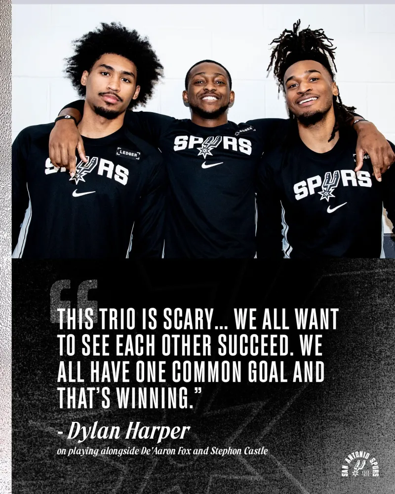賽前,媒曬馬刺社媒曬出達龍-福克斯、迪倫-哈珀、斯蒂芬-卡斯爾的合影照片,并配文: