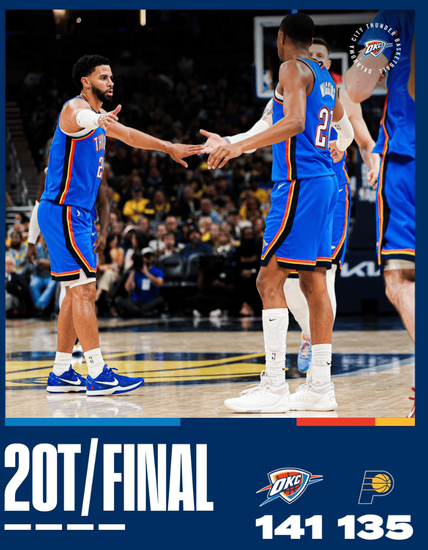 當(dāng)?shù)貢r(shí)間10月23日雷霆客場(chǎng)對(duì)陣步行者,節(jié)最最終經(jīng)過(guò)雙加時(shí)鏖戰(zhàn),后兩雷霆141-135戰(zhàn)勝步行者。分鐘