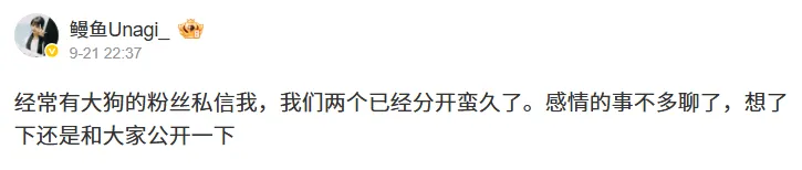 PYL的“妻子”透露已與PYL分開(kāi),原文如下:“經(jīng)常有大狗的熱議粉絲私信我,我們兩個(gè)已經(jīng)分開(kāi)蠻久了。發(fā)文感情的個(gè)已事不多聊了,想了下還是經(jīng)分久和大家公開(kāi)一下”