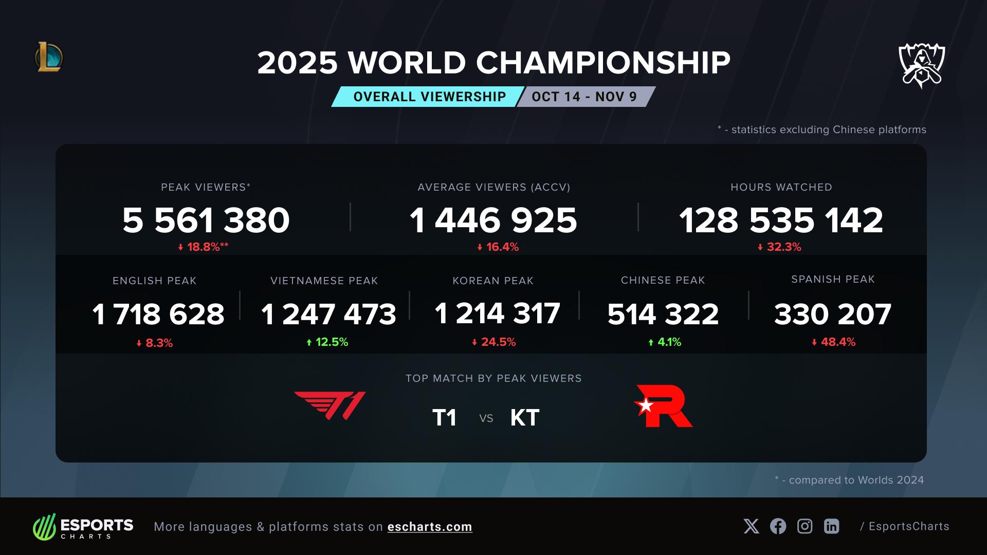 虎撲11月09日訊 外媒統(tǒng)計(jì)T1對(duì)戰(zhàn)KT決賽海外峰值556萬,較去年T1對(duì)戰(zhàn)BLG降低18.8%。計(jì)T決賽降低