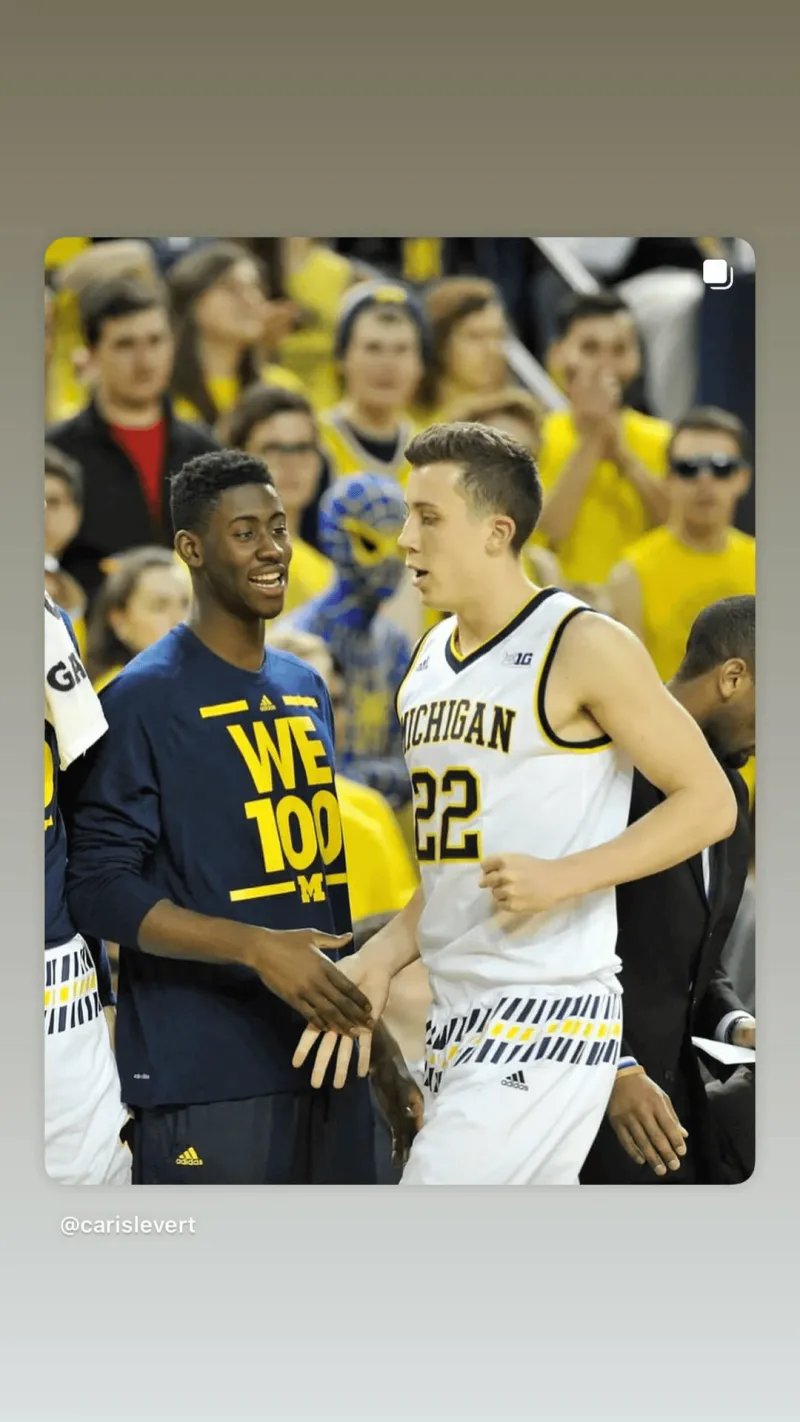 虎撲10月08日訊 活塞球員鄧肯-羅賓遜更新個(gè)人社交媒體,轉(zhuǎn)發(fā)了隊(duì)友卡里斯-勒韋爾發(fā)布的時(shí)期二人在大學(xué)時(shí)期的合照。
