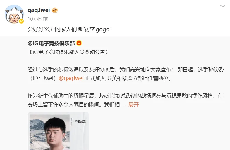 虎撲12月12日訊 Jwei轉(zhuǎn)評(píng)iG入隊(duì)公告,具體內(nèi)容如下: