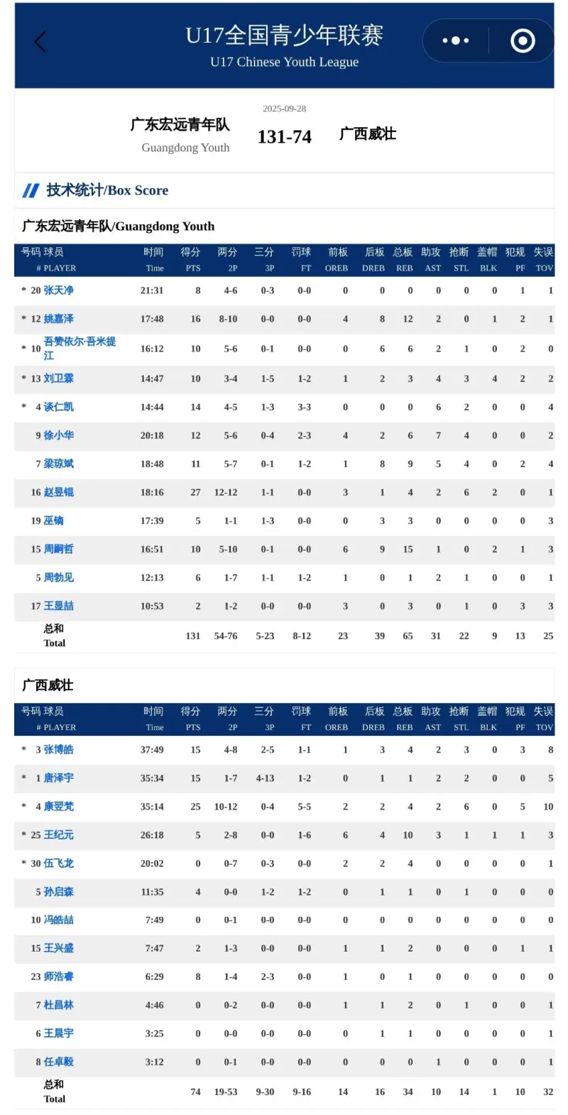 戰(zhàn)報(bào):U17首場(chǎng),宏遠(yuǎn)大勝?gòu)V西威壯的 數(shù)據(jù)統(tǒng)計(jì)(昱錕為本場(chǎng)的得分王)