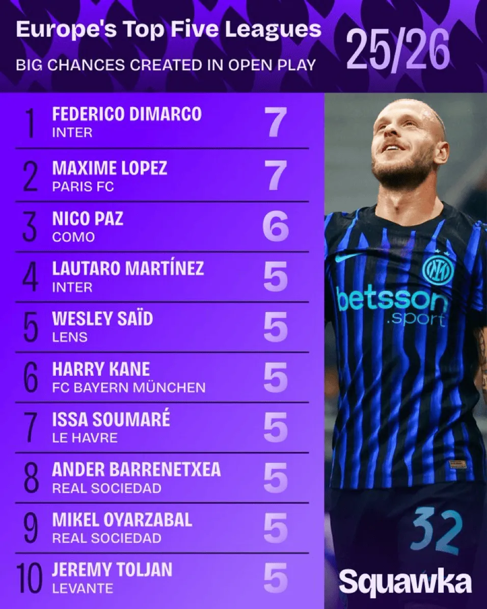 虎撲10月09日訊 根據(jù)Squawka的統(tǒng)計(jì),迪馬爾科是爾科本賽季五大聯(lián)賽目前在運(yùn)動(dòng)戰(zhàn)創(chuàng)造絕佳機(jī)會(huì)次數(shù)最多的球員: