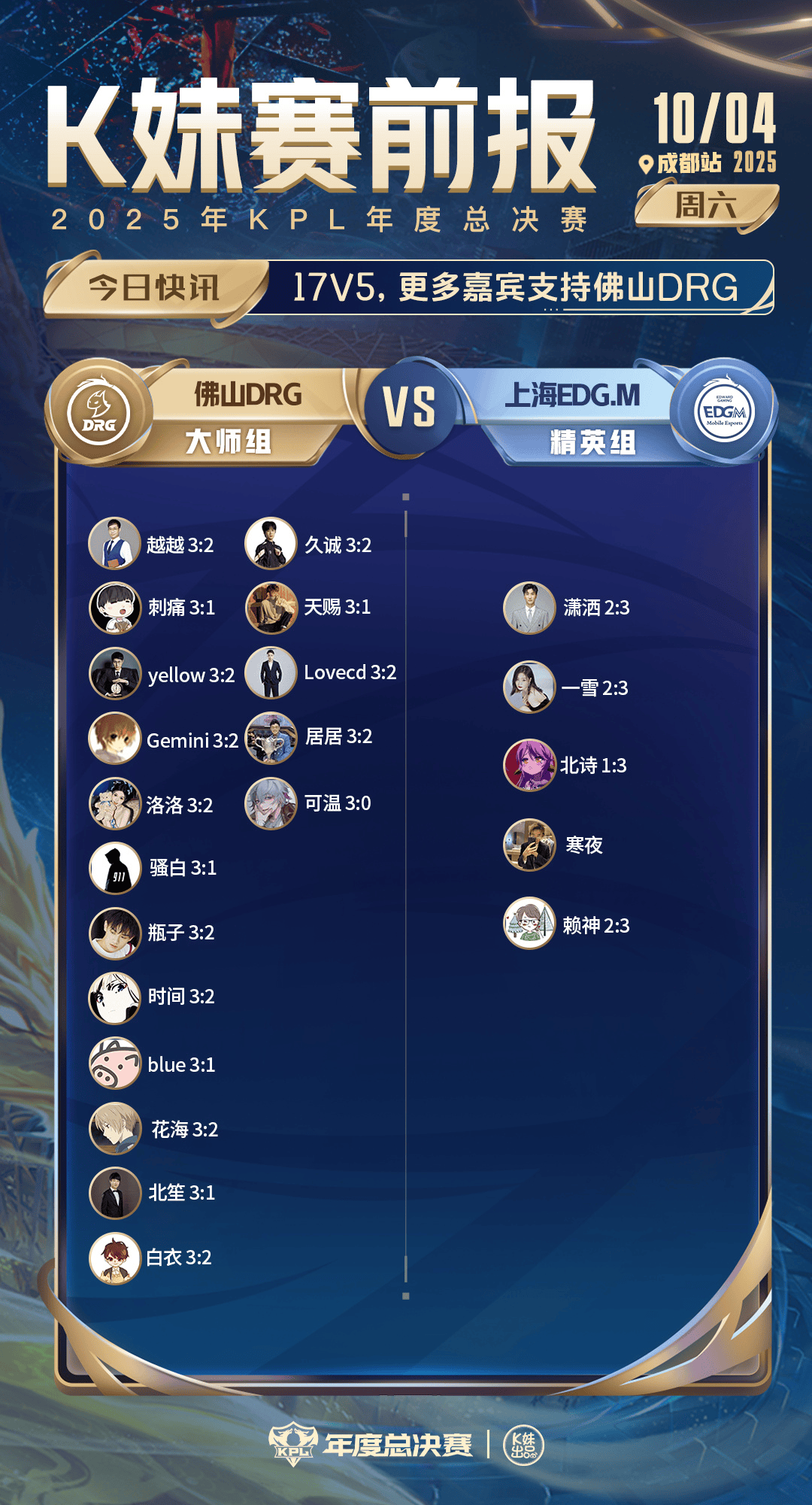 DRG對(duì)戰(zhàn)EDGM :17v5,看好更多嘉賓支持佛山DRG;