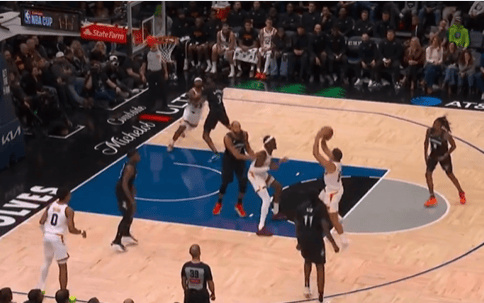 比賽第二節(jié),被里阿倫橫撤步欲三分被里德罩住,德罩轉(zhuǎn)而上下步騎馬射箭命中。而上