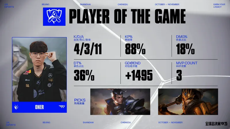 虎撲10月24日訊 在剛剛結(jié)束的S15世界賽瑞士輪T1對(duì)陣100T比賽中,Oner皇子打出4/3/11戰(zhàn)績,拿下拿下T1對(duì)陣100T第二局MVP,打出T對(duì)第局這是戰(zhàn)績陣他第3個(gè)MVP。
