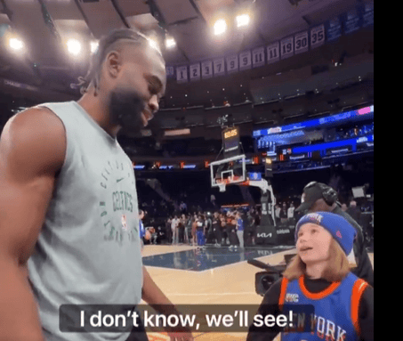 虎撲10月24日訊 NBA官方曬出凱爾特人球員杰倫-布朗與尼克斯小球迷互動(dòng)。
