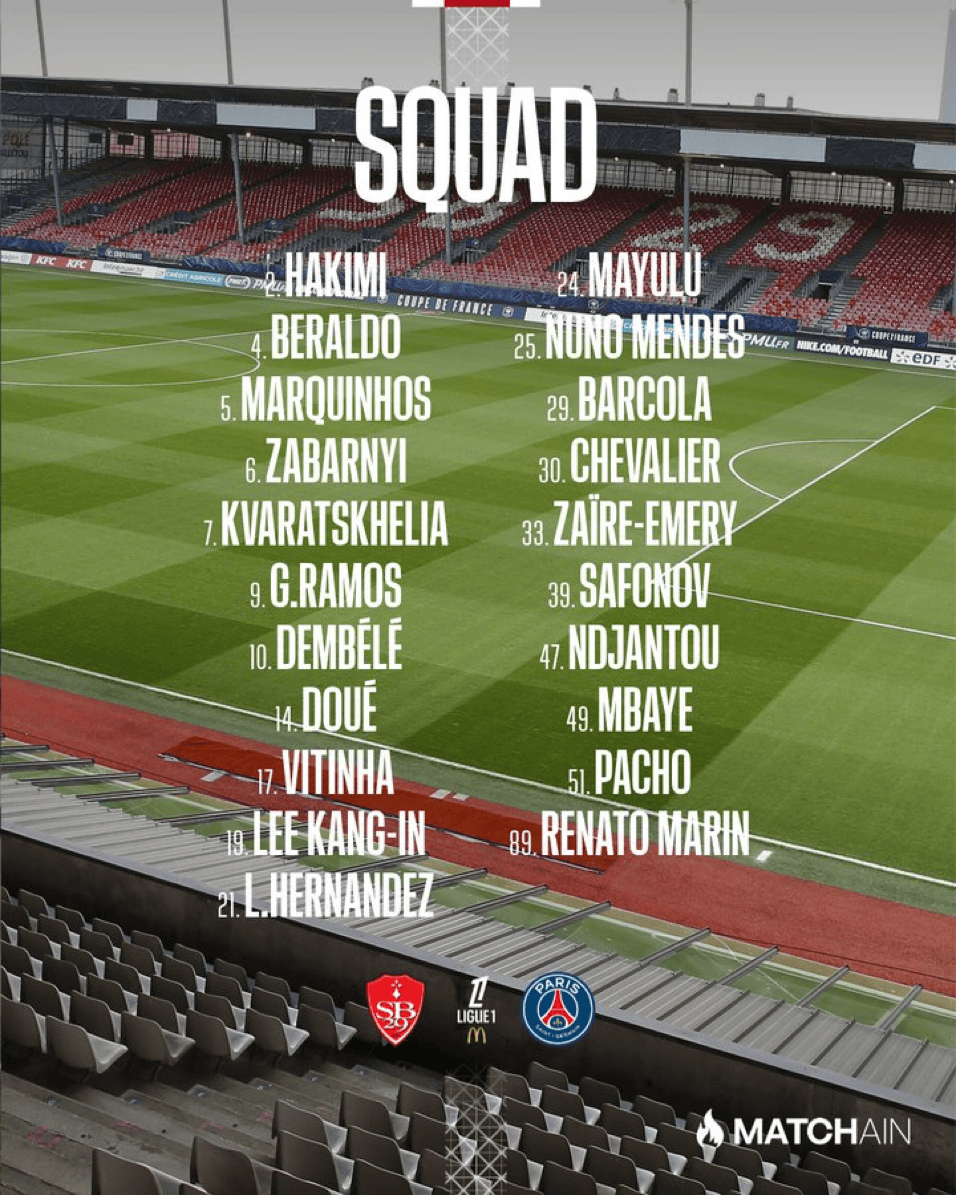 虎撲10月25日訊 北京時間今天晚間23點,法甲聯(lián)賽第9輪,巴黎圣日耳曼將做客挑戰(zhàn)布雷斯特。賽前,巴黎官方公布了本場比賽的大名單。