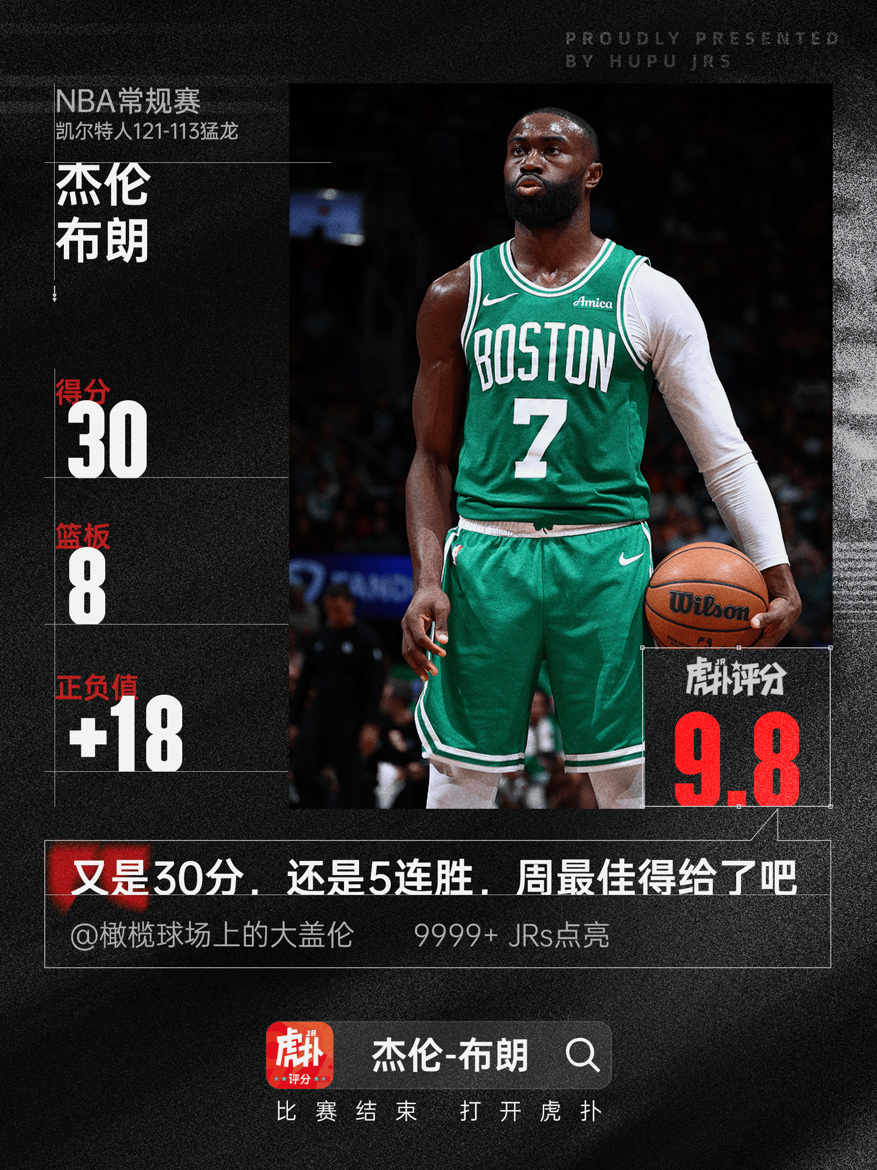 本場比賽,砍下凱爾特人球員杰倫-布朗出戰(zhàn)38分鐘,攻搶蓋19投9中,斷封其中三分球4投3中,發(fā)揮分籃罰球9投9中,出色得到30分8籃板5助攻1搶斷1封蓋。布朗板助