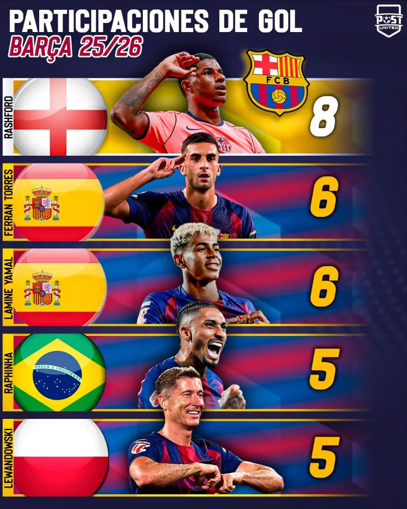 截至目前,馬庫斯·拉什福德是本賽季巴薩陣中參與進球(進球+助攻)最多的球員。