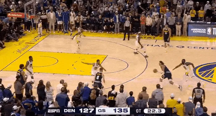 NBA常規(guī)賽,勇士對(duì)陣掘金的加速比賽正在進(jìn)行中。