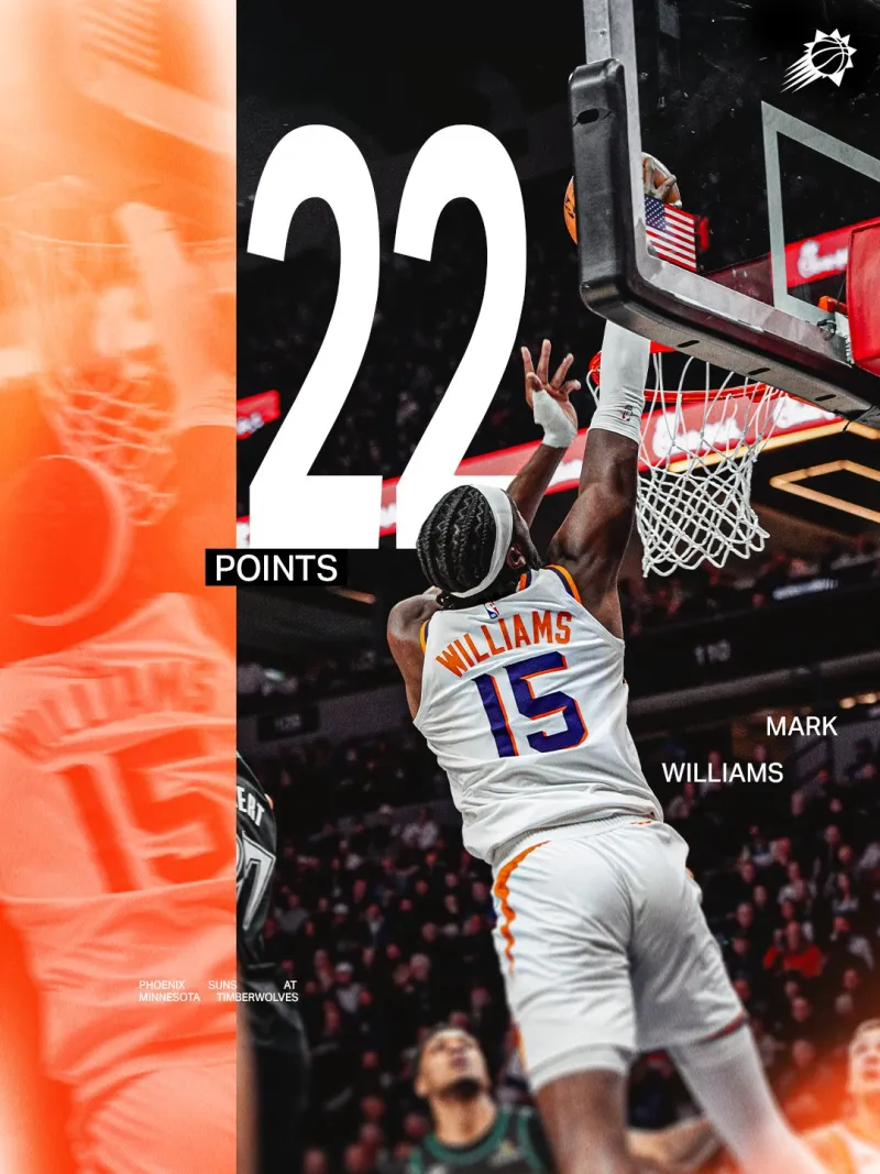 賽后,太陽(yáng)社媒曬出馬克-威廉姆斯本場(chǎng)比賽個(gè)人數(shù)據(jù)和賽場(chǎng)精彩瞬間的海報(bào),并配文: