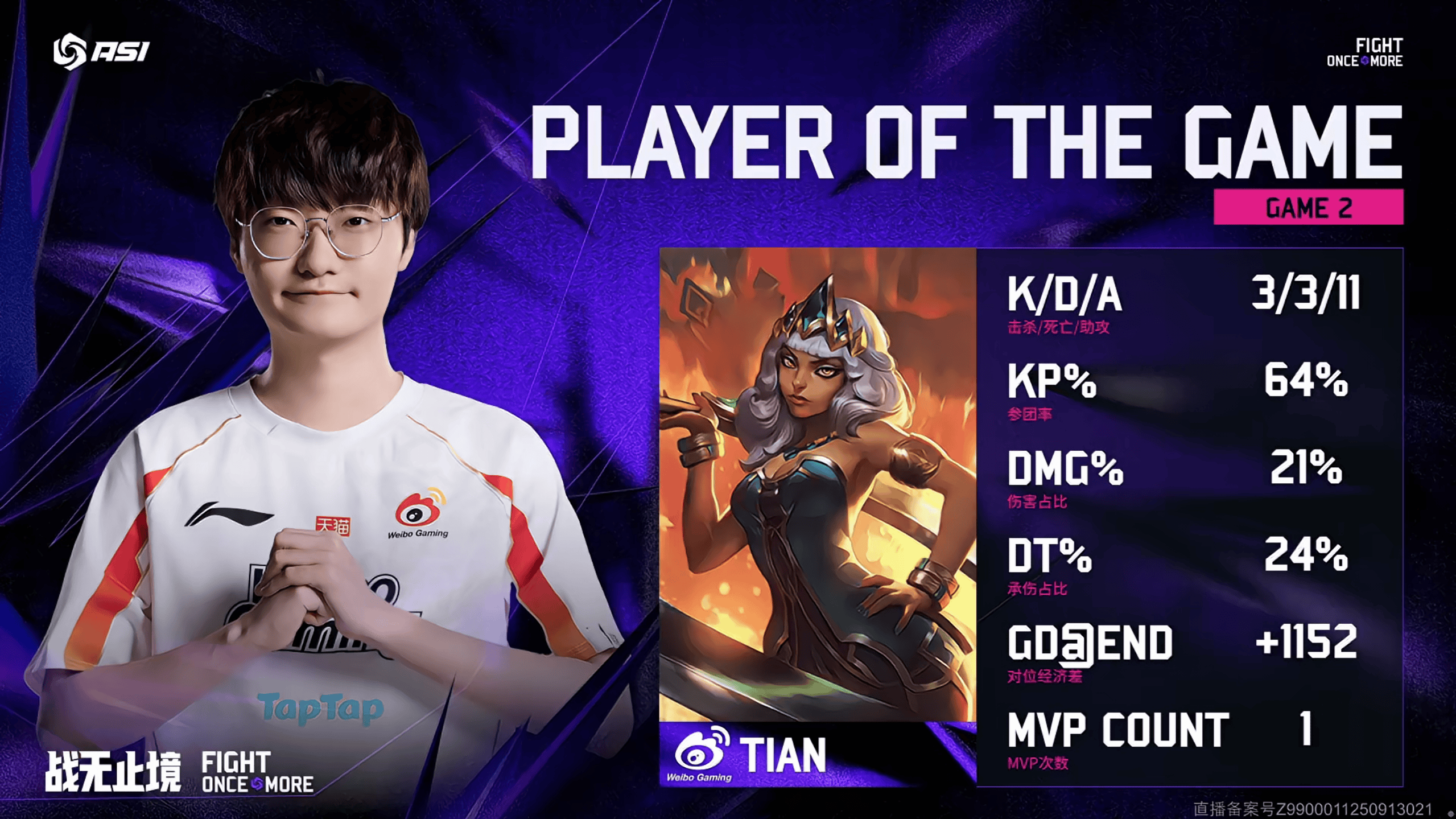 虎撲10月06日訊 在剛剛結(jié)束的亞洲邀請(qǐng)賽WBG對(duì)陣GAM比賽中,Tian琪亞娜打出3/3/11戰(zhàn)績,戰(zhàn)績陣拿下WBG對(duì)陣GAM第二局MVP,拿下這是亞娜他第1個(gè)MVP。