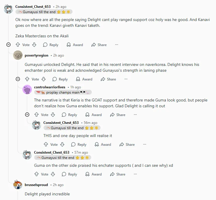 流行的說法是Keria是有史以來最強(qiáng)的輔助,因此是他讓Gumayusi看起來很強(qiáng),但人們沒有意識到Gumayusi在如何成就他的輔助。很高興Delight說出了這一點(diǎn)。