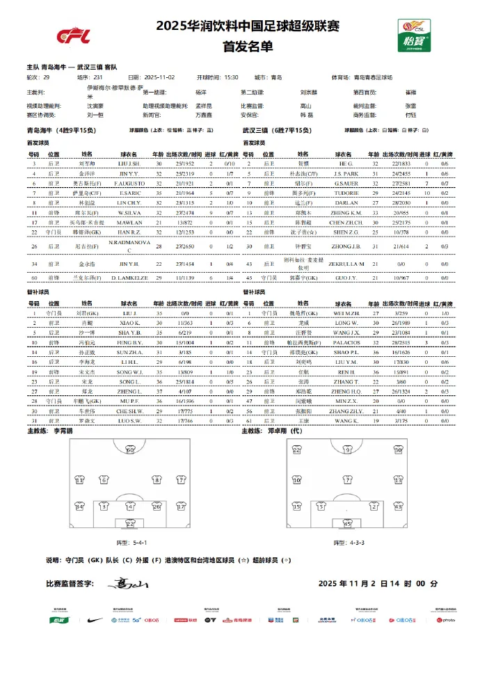 虎撲11月02日訊 今天15:30,中超第29輪,外援外援青島海牛主場對(duì)陣武漢三鎮(zhèn),益金永浩賽前雙方公布了首發(fā)陣容: