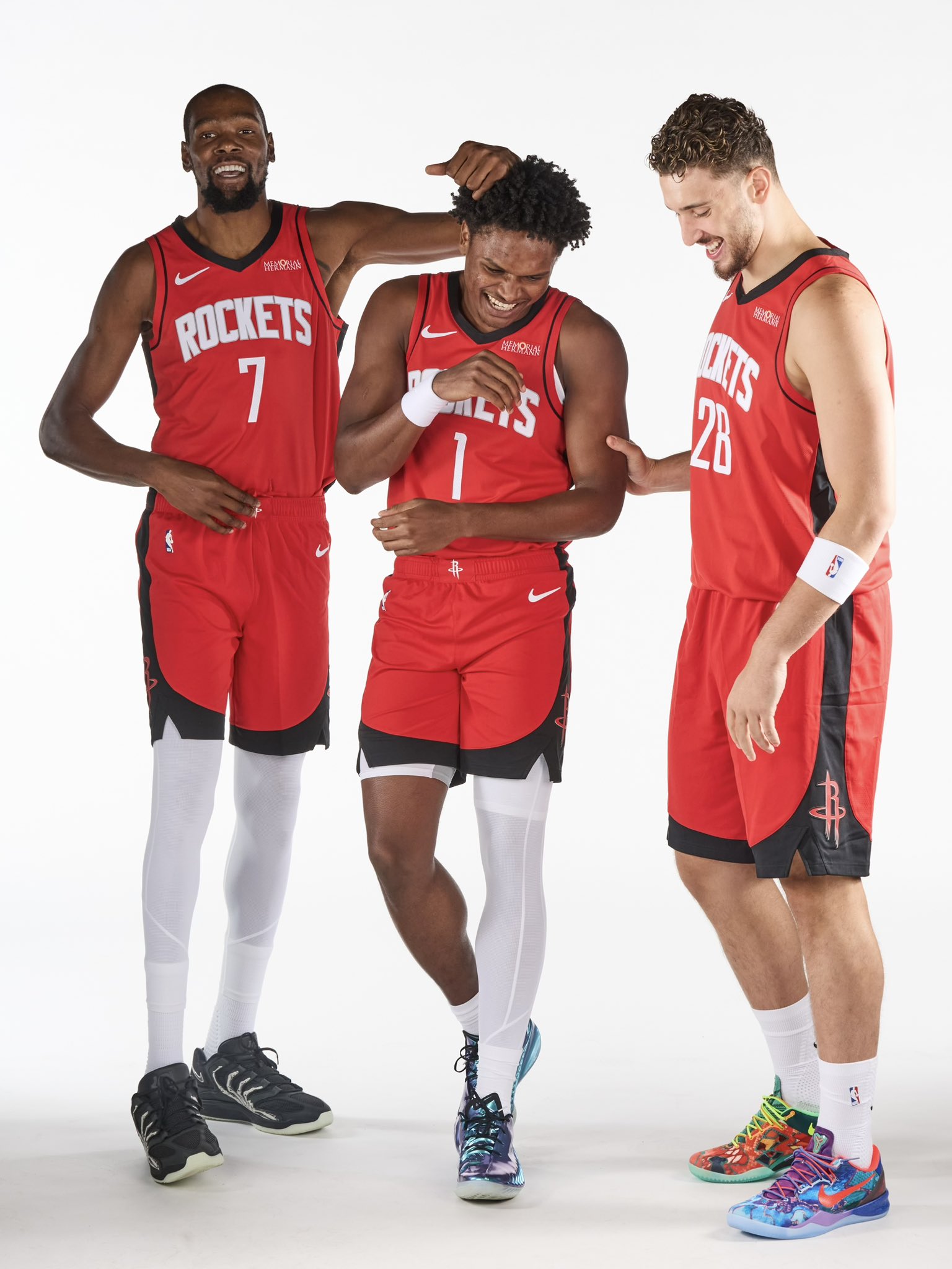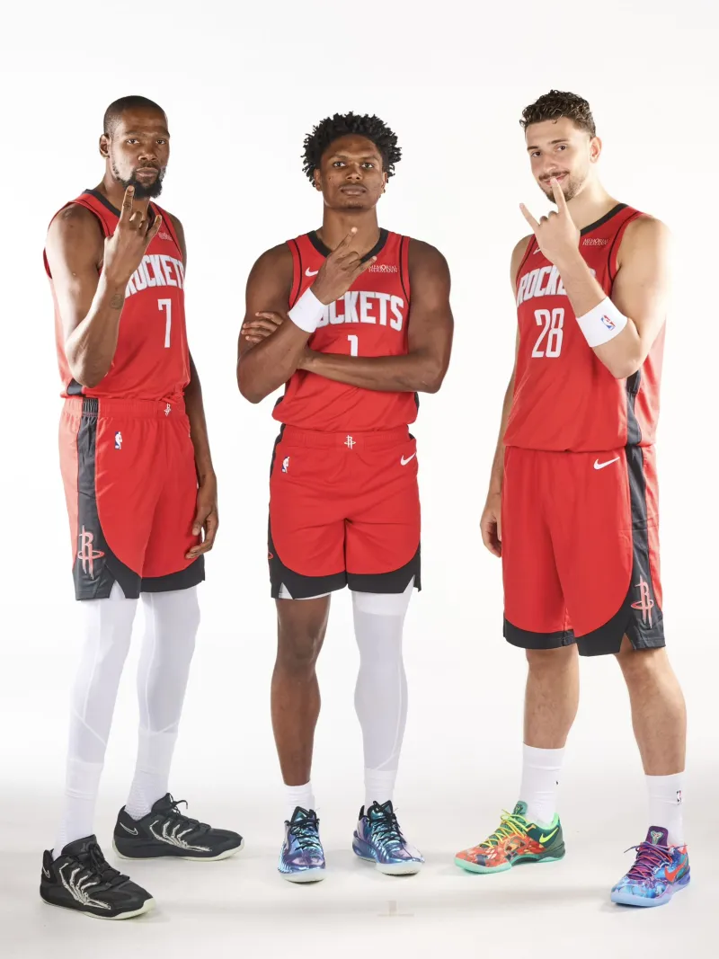 來源:X今日,火箭社媒曬出凱文-杜蘭特、板新阿爾佩倫-申京、火箭合影阿門-湯普森的三人合影照片。